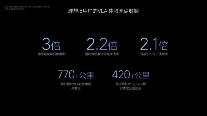 自8月20日理想i8与VLA司机大模型同步交付以来,市场反响热烈。首批理想i8用户中的单日最长VLA行驶里程超770公里,单次最长VLA行驶里程超420公里。VLA随理想i8上市交付后,辅助驾驶每日使用率提升3倍,累计里程渗透率提升2.2倍,泊车每日使用率提升2.1倍,也意味着VLA司机大模型成为了用户真的爱用且好用的辅助驾驶。